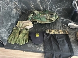 Il y a un casque tactique militaire avec lampe, gant tactique couleur kaki, cache cou, la marque DYE CAMO, protège cheveux DYE, gilet tactique militaire, ceinture militaire pour bouteille et pot.