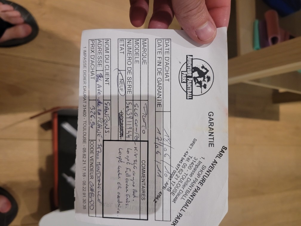 - Marqueur Proto SLG 10 : Le marqueur fonctionne mais il a une fuite d'air au niveau du tuyau de raccordement du régulateur "Hyper3" (poignée).